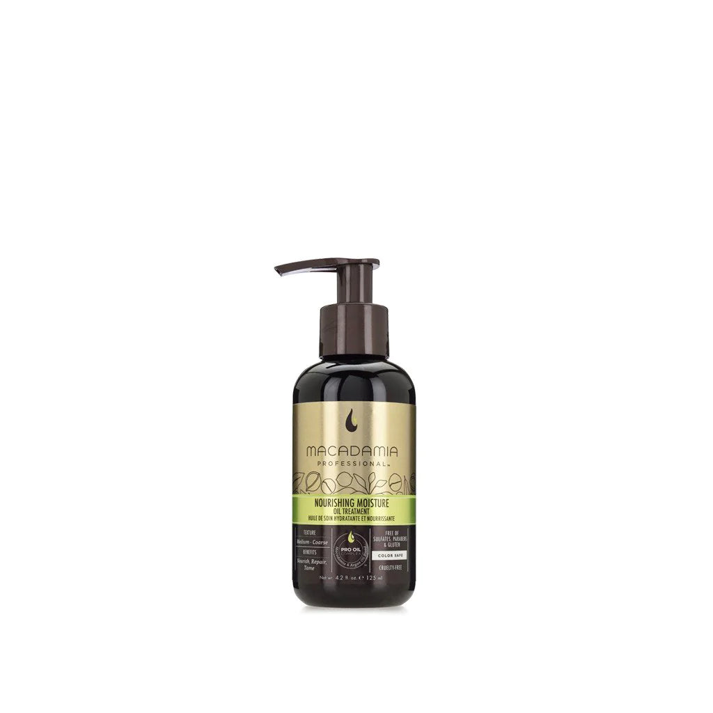Nourishing Moisture for Medium to Coarse Hair Macadamia Professional Nourishing Moisture Hair Oil Treatment, infused with the macadamia and Argan Pro Oil Complex blend, is a non-greasy, hydrating oil that instantly absorbs into the hair. It provides moisture, increases softness and creates luminous shine. Vitamin E hydrates and provides intense nourishment leaving medium to coarse hair textures de-frizzed and ultra- smooth. Blow-dry time is reduced! 125ml Features: