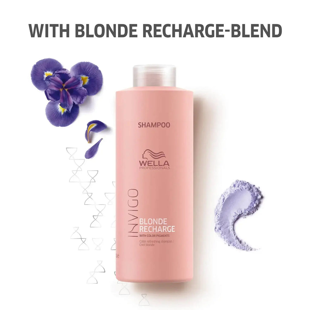 Wella Professionals Invigo Blonde Recharge Color Refreshing Shampoo 1000ml is a violet shampoo that refreshes and maintains the brightness and vibrancy of natural or highlighted blondes while preventing yellowing and eliminating brassiness.